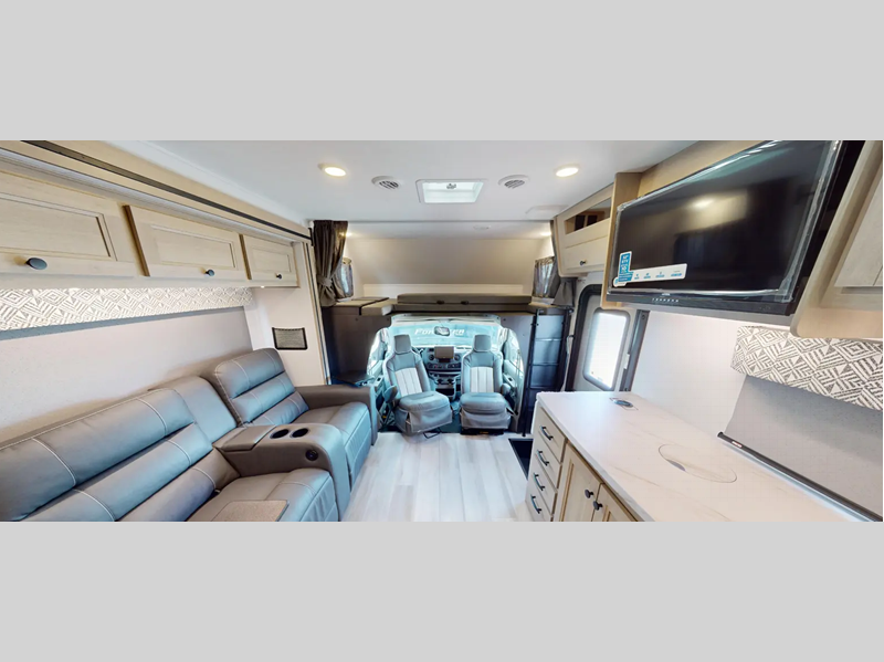 Sleeps 7 Slides 2 Length 30 ft 9 in Ext Width 8 ft 5 in Ext Height 11 ft 3 in Exterior Color Standard Graphics. Full-Body Paint; Pacific, Garnet GVWR 14500 lbs Fresh Water Capacity 44 gals Grey Water Capacity 39 gals Black Water Capacity 39 gals Furnace BTU 30000 btu Generator 4.0 kW Gas Fuel Type Gasoline Chassis Ford Fuel Capacity 55 gals Wheelbase 202 in Number Of Bunks 1 Available Beds RV Queen Refrigerator Type 12V Refrigerator Size 10.7 cu ft Convection Cooking Yes Cooktop Burners 3 Shower Size 24" x 36" Number of Awnings 1 Axle Weight Front 5000 lbs Axle Weight Rear 9600 lbs LP Tank Capacity 41 lbs Water Heater Capacity 6 gal Water Heater Type DSI Gas/Electric AC BTU 15000 btu TV Info LR 12V LED TV, BR 12V TV Awning Info 16' Power w/LED Light Strip Gross Combined Weight 22000 lbs Shower Type Standard Electrical Service 30 amp Similar Floorplans