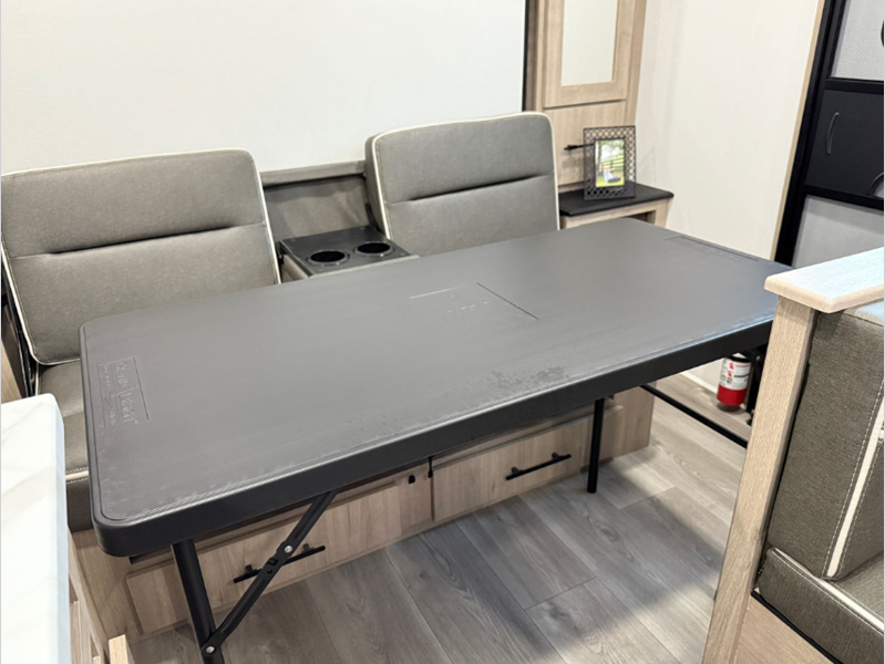 The gel coated fiberglass exterior is sure to turn heads at the campsite, and the spare tire and carrier will come in handy. You will also love the four included packages, such as the AIM Solar Package with off-grid features and the AIM Four Seasons Protection Package to keep you comfortable on camping trips!