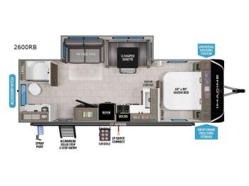 ยExperience the ultimate in comfort and convenience with this luxurious travel trailer. When you enter this trailer, you'll find convenient shoe storage to your right below the wardrobe/pantry. The full rear bathroom has a 30" x 36" shower with skylight for you to rinse off after you come in from an afternoon hike, and you can lounge on the tri-fold sofa or U-shaped dinette with removable ottoman after you are clean. The large slide creates more interior space, so you can cook freely on the three-burner range with oven in the kitchen, also, you can cook on the outside griddle. You'll have a private bedroom that you can retreat to at the end of a long day, and the 60" x 80" queen bed will provide comfort while you sleep.ยJust imagine leaving the world behind and secluding yourself away with your favorite people in your Grand Design Imagine travel trailer! The Imagine has been designed to enjoy camping and includes a high-capacity furnace, a heated and enclosed underbelly with suspended tanks, a designated heat duct to the subfloor, and a high-density roof insulation with attic vent. You'll have a large panoramic window to let natural lighting in and an adjustable Power Awning with LED Lights for those night gatherings. The exclusive drop-frame pass-through storage compartment is going to allow you to bring along lots of equipment, and the universal docking station is an all-in-one location for utilities and hook-ups. You'll also have oversized tank capacities so that you can fill and empty your tanks less often.We have 2 2600RB availableView InventorySpecifications