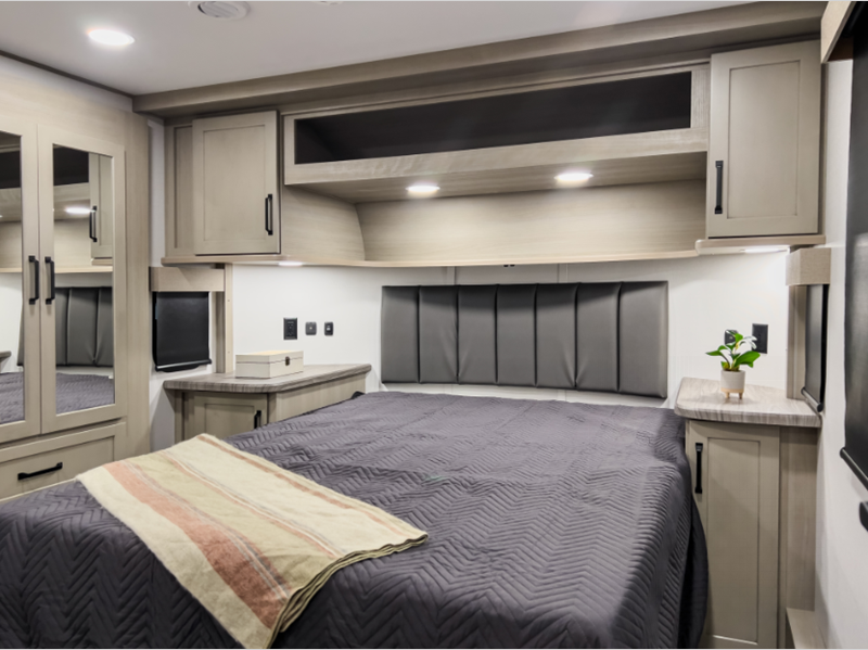 Each model also includes a universal docking center, a fiberglass front cap with paint and LED lighting, a heated and enclosed underbelly for four seasons of traveling, and a dovetail rear end. The Momentum G-Class also comes with large panoramic windows, residential cabinetry, motion-sensor lighting, and stainless steel-accented appliances. The fun will not stop when listening to the exterior speakers, and the awning with LED lighting will create an outdoor living space you are sure to love.