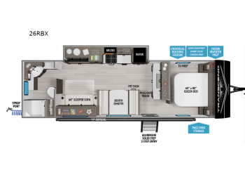 Sleeps 5 Slides 1 Length 31 ft 6 in Ext Width 8 ft Ext Height 11 ft Int Height 6 ft 6 in Hitch Weight 627 lbs GVWR 7695 lbs Dry Weight 6147 lbs Fresh Water Capacity 56 gals Grey Water Capacity 78 gals Black Water Capacity 39 gals Tire Size ST205/75R15LRD Furnace BTU 35000 btu Available Beds Queen Refrigerator Type 12V Cooktop Burners 3 Shower Size 27" x 36" Number of Awnings 1 LP Tank Capacity 20 lbs Water Heater Type Tankless AC BTU 13500 btu Awning Info 19' Power w/LED Light Axle Count 2 Number of LP Tanks 2 Shower Type Walk-In Shower Similar Travel Trailer Floorplans