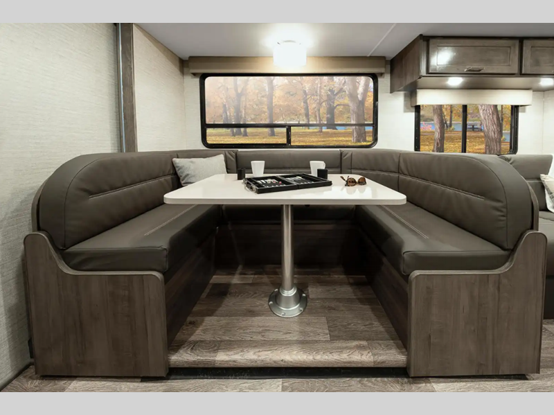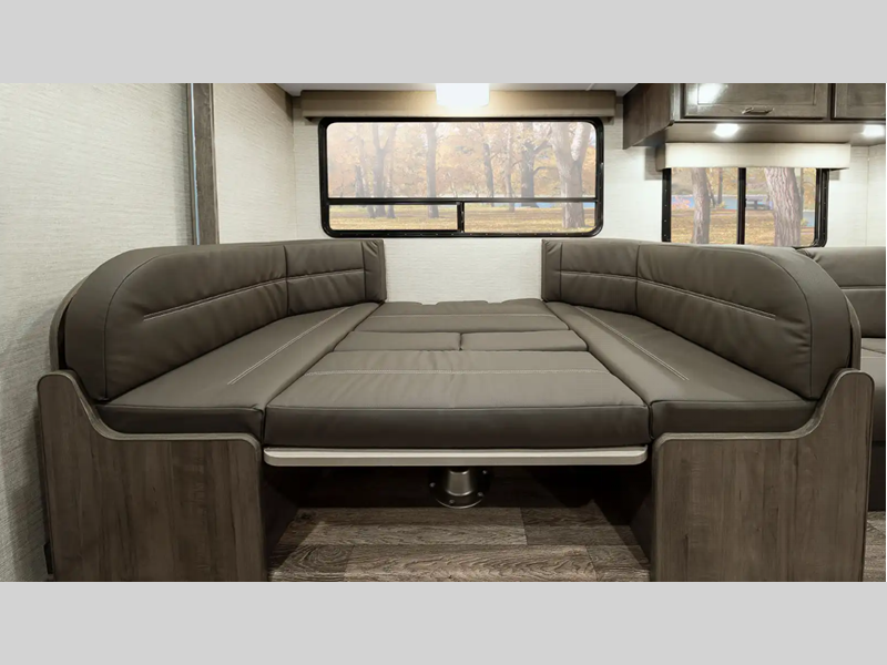 The interiors provide enough space and innovative features for your family and gear so you can enjoy the outdoors with the creature comforts of home too. Each model offers flexible sleeping options with a large cabover bunk, convertible dinette, and sofa beds. The 7.3L V8 premium engine makes short work of long hills and the cab has a commanding view of the road with a comfortable place to sit in the captain's chairs which have fixed lumbar support and multi-adjustable slide/recline positions.