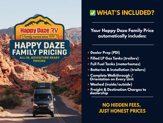Happy Daze RV is not responsible for any misprints, typos, or errors found in our website pages. Any price listed excludes sales taxes, registration, tags and delivery fees. Manufacture pictures, specifications, and features may be used in place of actual units on our lot. To preserve the quality and mileage of our coaches, we only do test drives with a qualified offer to purchase.