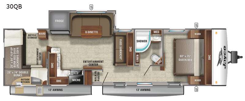 You can easily load and unload all your clothing, gear and food using the two entry doors for a fun weekend or long vacation in this travel trailer.ย The kids will surely claim the rear private bunkhouse with quad bunks, an entertainment center and a wardrobe for their things.ย You can use the bicycle storage door to transport your bikes to and from the campgrounds which is handy and secure. When you need to get away head to the front private bedroom with a walk-around queen bed and your own storage including nightstands.ย The full bathroom will keep everyone refreshed, and the indoor full kitchen offers everything you will need including an L-shaped counter and walk-in pantry.ย Yet you will love using the outside kitchen, and relaxing under one of the two 13' power awnings.ย There are options to choose from to customize your RV such as adding an L-lounger or theater seating, take a look today.ย